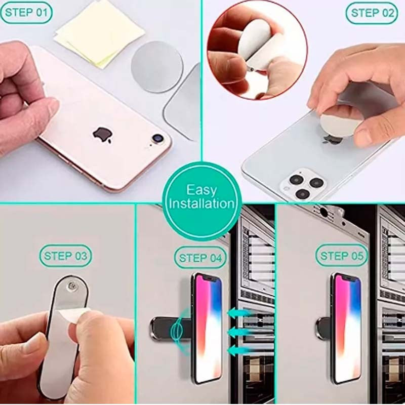 Fácil instalação: sem necessidade de ferramentas! Basta remover o adesivo e colar o suporte em qualquer superfície. Além disso, inclui placas de metal para o seu telefone. Fixe as placas de metal diretamente no seu telefone ou simplesmente insira-as entre o seu telefone e a capa de celular;